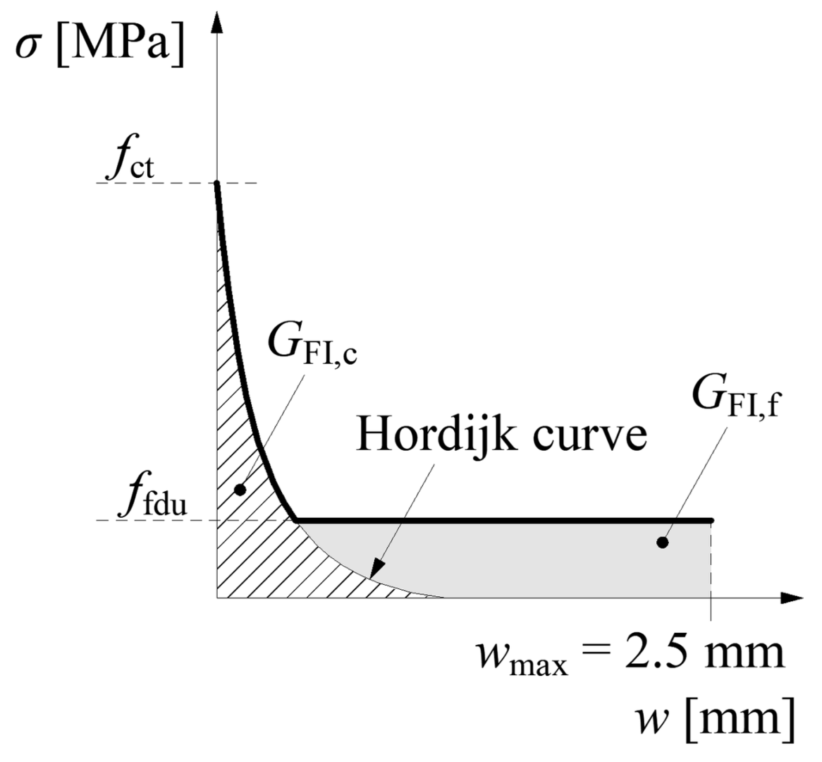One of the fundamental aspects of modeling concrete in ATENA is its use of a combined failure surface model. The software utilizes a William-Menétrey failure surface for compression and a Rankine surface for tension, which together allow for a realistic depiction of concrete behavior under stress [2, 3]. For post-cracking behavior, ATENA applies the Hordijk curve [4] in conjunction with the crack band method [5], ensuring that the quasi-brittle characteristics of concrete are appropriately modeled.