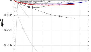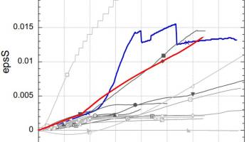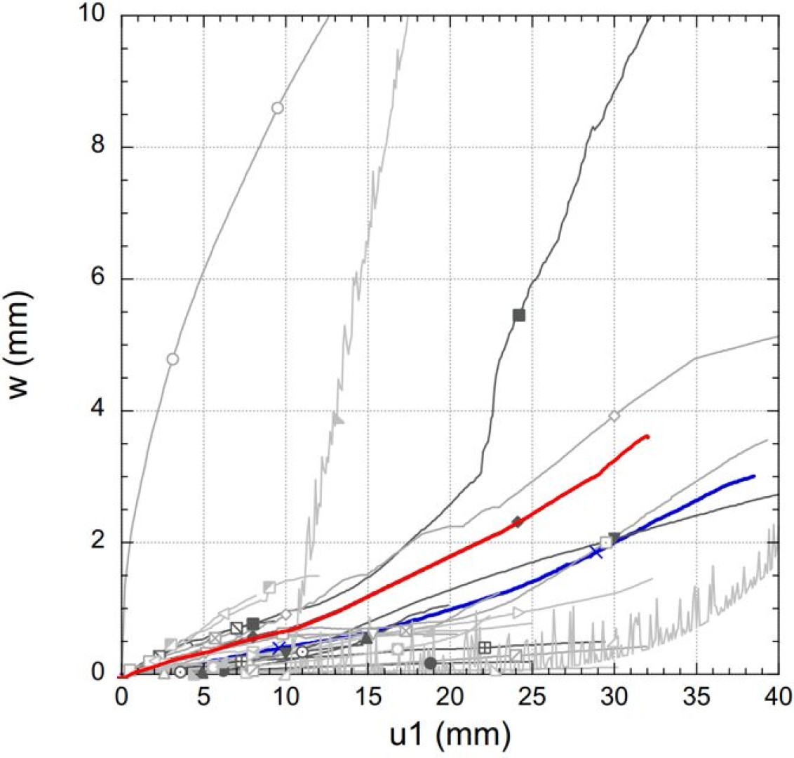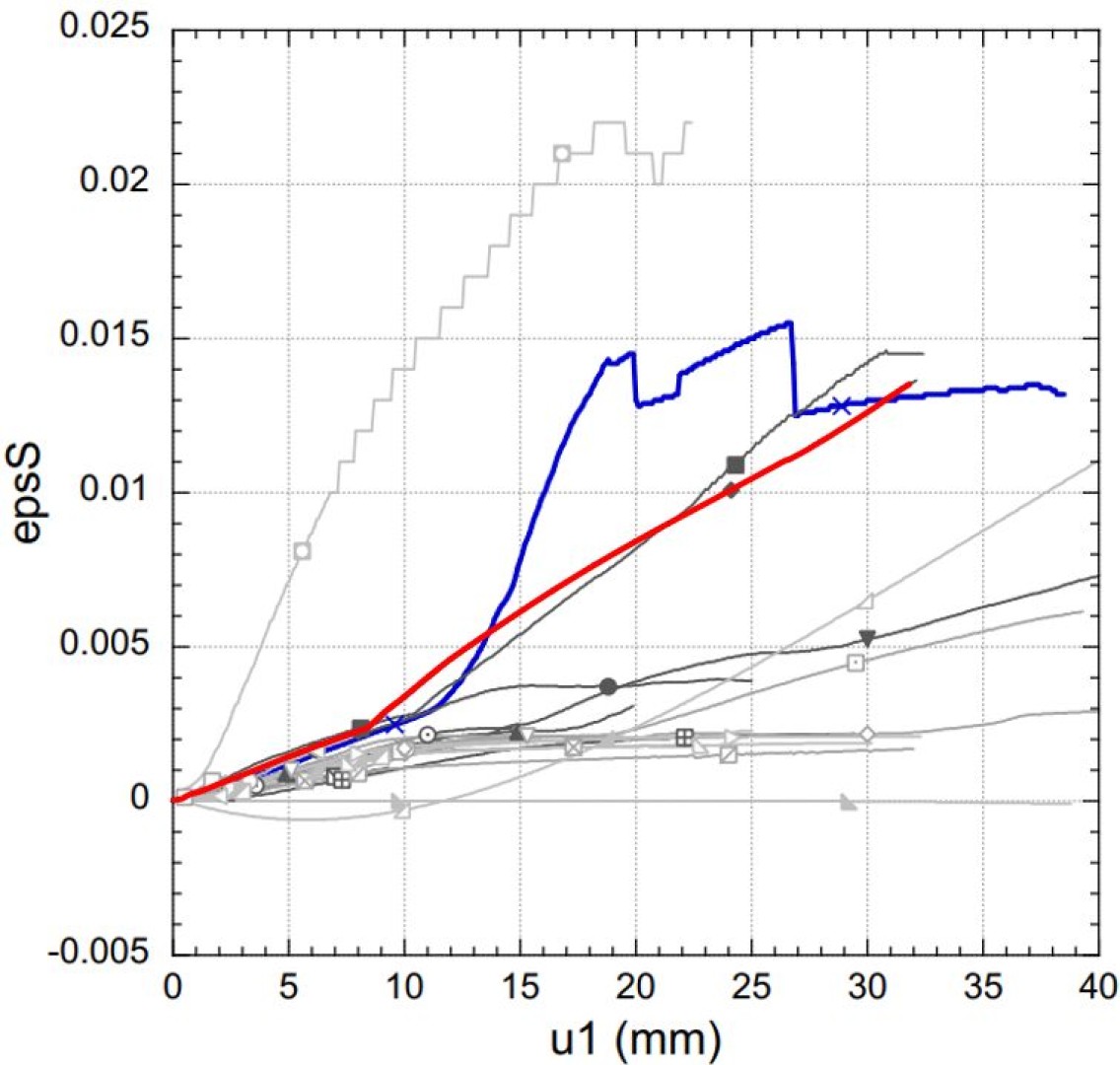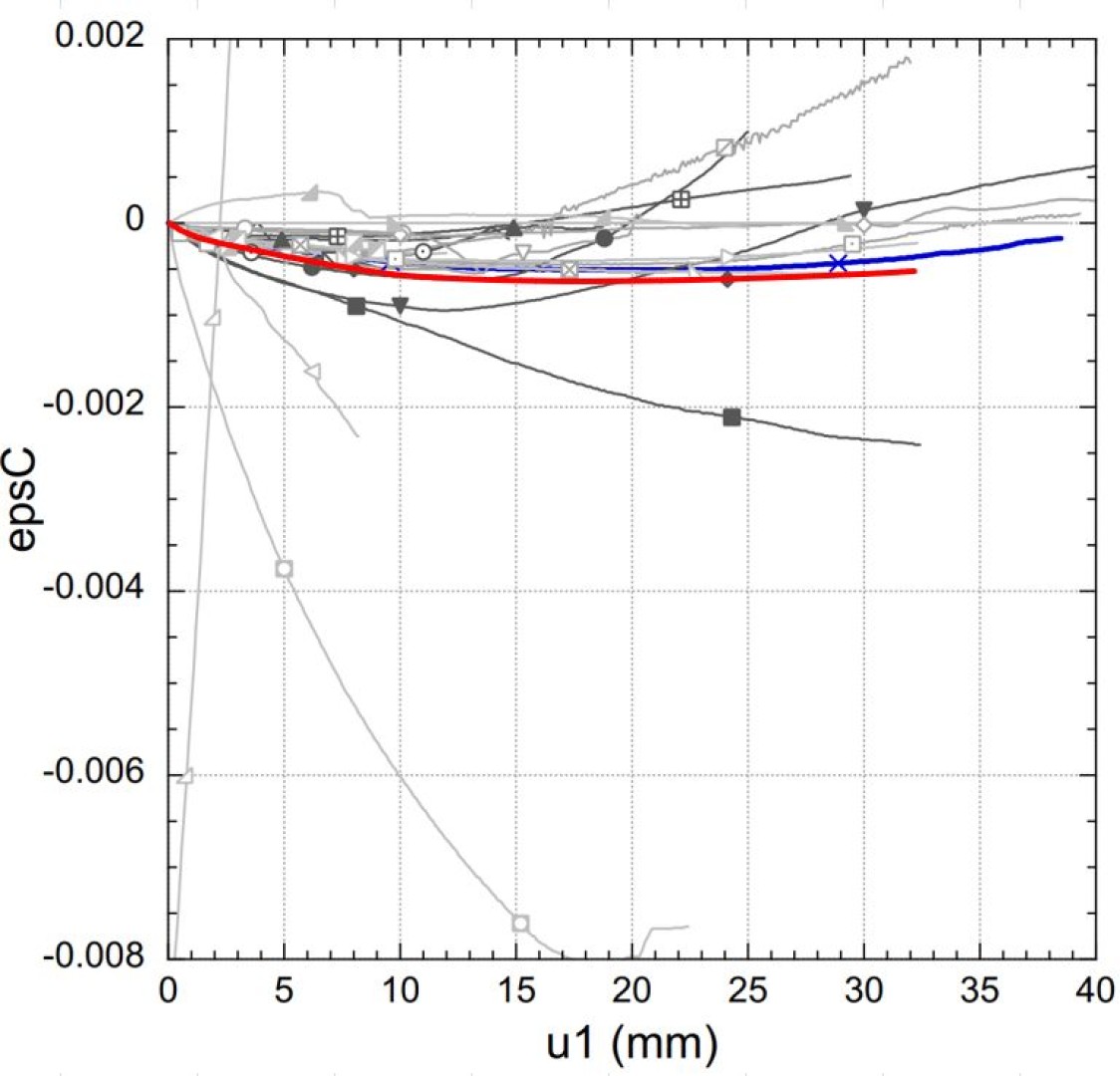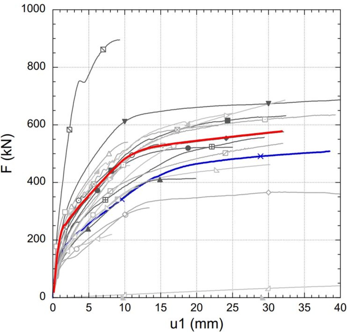 In the attached figures, the numerical results (red line) are compared with the real test results (blue line).